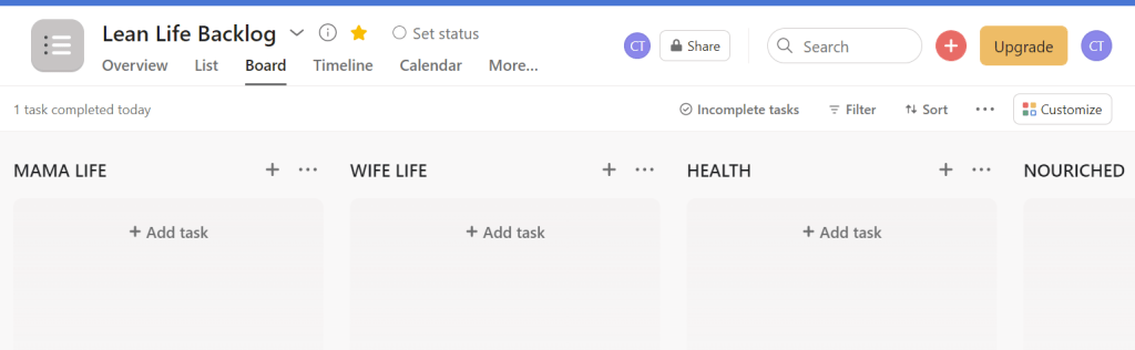 Second, I created two backlogs: A product backlog and a timebound sprint backlog in Asana (You can use any tool you’d like, like Google Keep, or simple pen and paper). Now, if you’re an agilist like me, you must be wondering why I used a Scrum method for the Kanban inspired term. lol. Its nothing noteworthy – just a bias I have for scrum… don’t focus too much on the methodology.