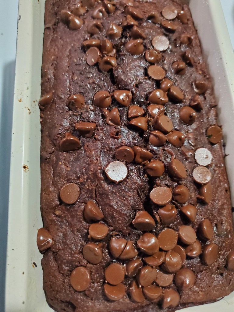 - Sprinkle the rest of the chocolate chips all over the top of the batter in the loaf pan