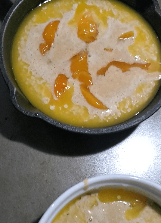 - Slowly pour the cobbler batter into the ramekin with the butter. Do not stir.