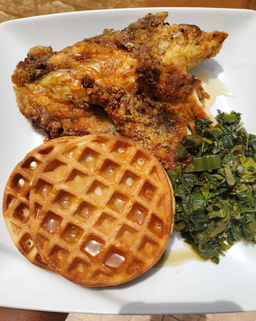Plate your crispy air-fried chicken and waffles and drizzle with honey to serve. I serve mine with some Jamaican sauteed callaloo to amp up the nutrient density of the meal (because veg is life!) Enjoy!